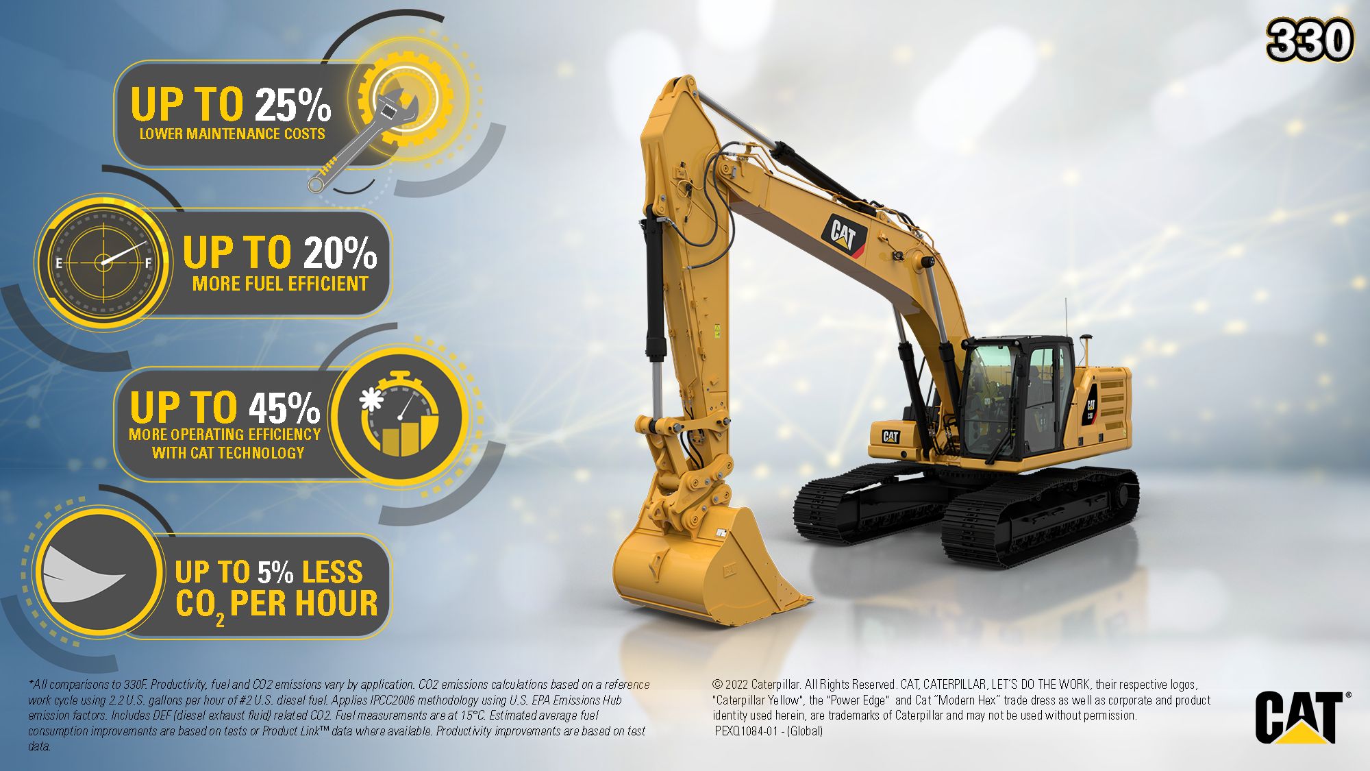 *All comparisons to 330F. Productivity, fuel and CO2 emissions vary by application. CO2 emissions calculations based on a reference work cycle using 2.2 U.S. gallons per hour of #2 U.S. diesel fuel based. Applies IPCC2006 methodology using U.S. EPA Emissions Hub emission factors. Includes DEF (diesel exhaust fluid) related CO2. Fuel measurements are at 15°C. Estimated average fuel consumption improvements are based on tests or Product Link® data where available. Productivity improvements are based on test data.